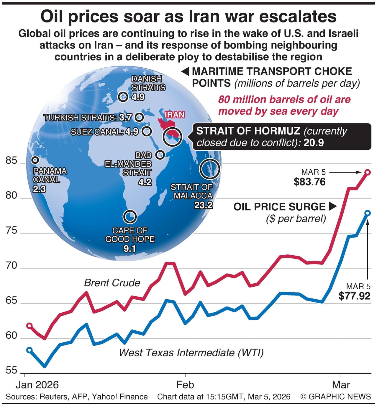 As of 15:15GMT, March 5, 2026, the Brent Crude oil price was $83.76 and the West Texas Intermediate (WTI) oil price was $77.92 – up 18% and 19% respectively on where they closed at the beginning of last week.