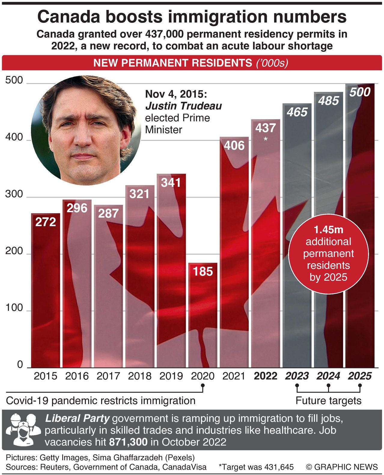 Canada granted over 437,000 permanent residency permits in 2022, a new record, to combat an acute labour shortage.