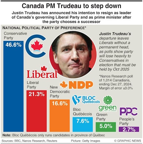 Prime Minister Justin Trudeau of Canada, trolled by President-elect Trump as the governor of America's 51st state, announced that he would step down as the country's leader.