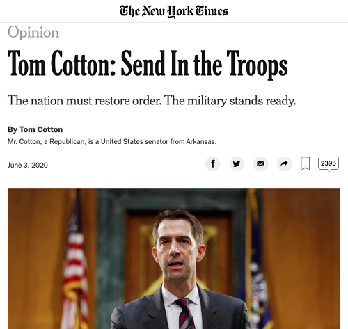 During the same riots, Sen. Tom Cotton, an Arkansas Republican, wrote a New York Times op-ed titled "Send in the Troops." Cotton was reacting to violent protesters who had damaged part of the U.S. Treasury building and burned down part of a 200-year-old church in front of Lafayette Park in the White House annex. Cotton argued in the op-ed that the first responsibility of the government is to protect life and assets - and should it be necessary, as a last resort, the President has the authority - under the Insurrection Act - to call in the military. Cotton said this had been done in California in 1992 and even earlier, in his state of Arkansas, in the 1960s.