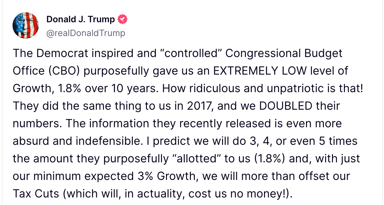 “The information they recently released is even more absurd and indefensible,” Trump wrote. He predicted the economy would grow three to five times the CBO’s estimate, with a “minimum expected 3% growth” offsetting the cost of his tax cuts.