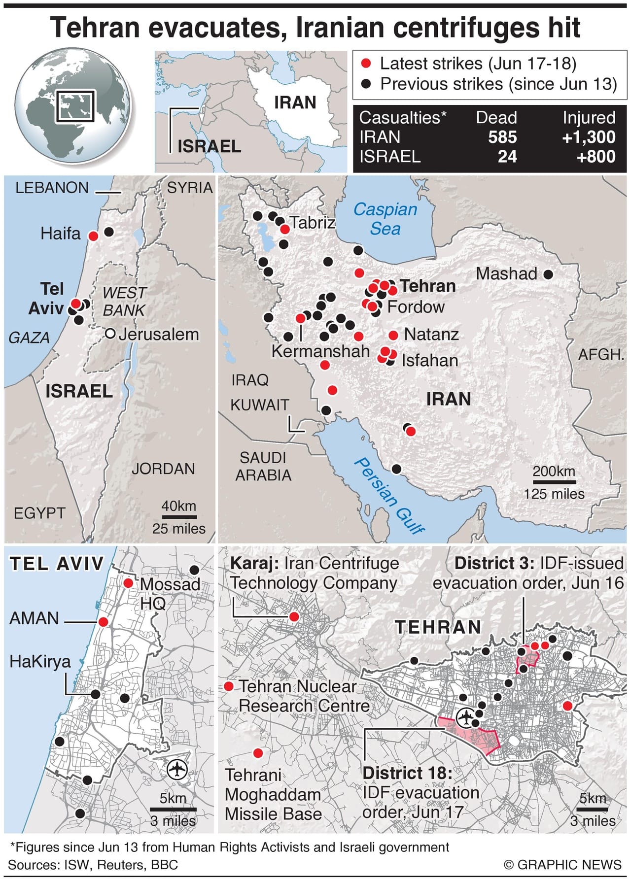 A Washington-based Iranian human rights group says that Israeli strikes have killed 585 people in Iran, around 125 of them military personnel, an injured over 1,300. 24 people have died in Iranian missile attacks on Israel, with no new casualties overnight.