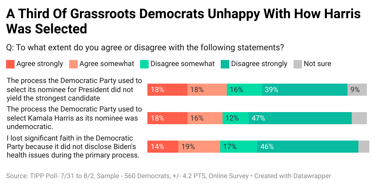 While the party’s leaders project an image of unity, a significant portion of grassroots Democrats express deep dissatisfaction with the process used to select Kamala Harris as the nominee. As shown in the chart below, about a third of Democrats believe the process was undemocratic, and many have lost faith in the party due to the lack of transparency regarding Biden’s health.