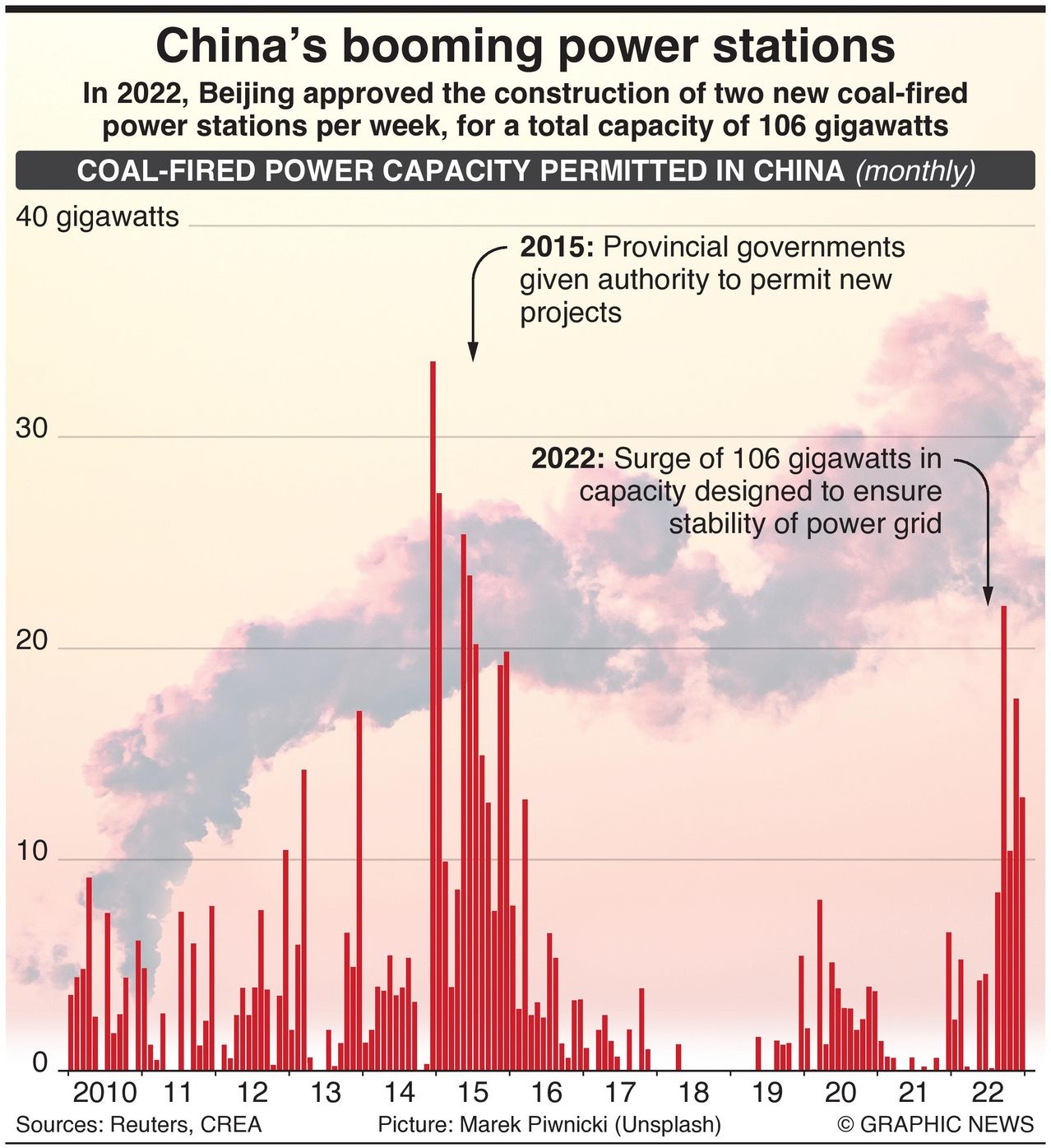 China approved the construction of 106 gigawatts of coal-fired power station capacity in 2022, the highest amount since 2015 – a rate of two new power stations every week.