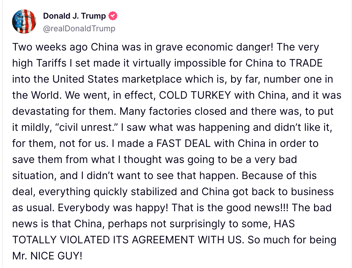 President Donald Trump on Friday accused China of violating a trade agreement he said was hastily arranged to save its collapsing economy. In a post on Truth Social, Trump claimed his sweeping tariffs had pushed China to the brink of economic disaster, shutting down factories and sparking civil unrest.