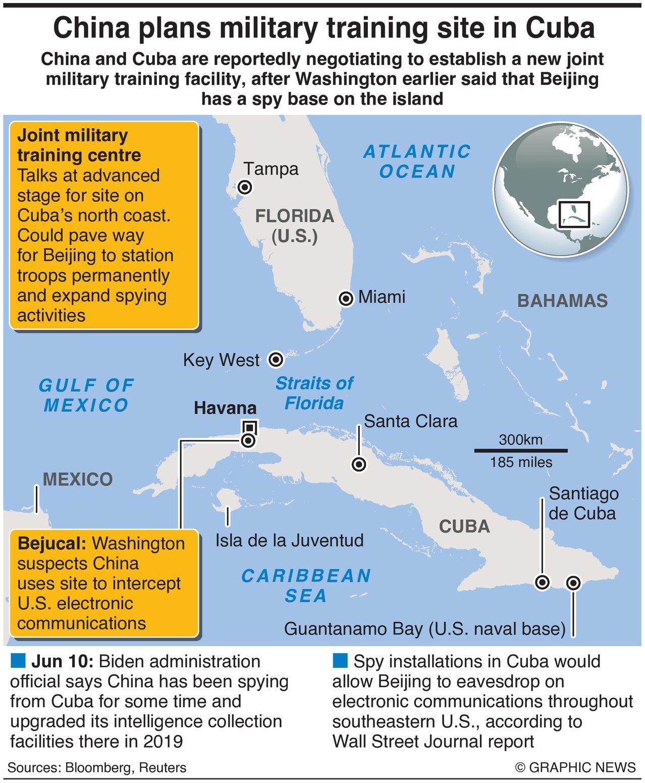 The two countries were holding advanced talks about opening the facility in northern Cuba, the Wall Street Journal on Tuesday cited U.S. officials as saying, adding that it could pave the way for Beijing to station troops there permanently and expand espionage activities.