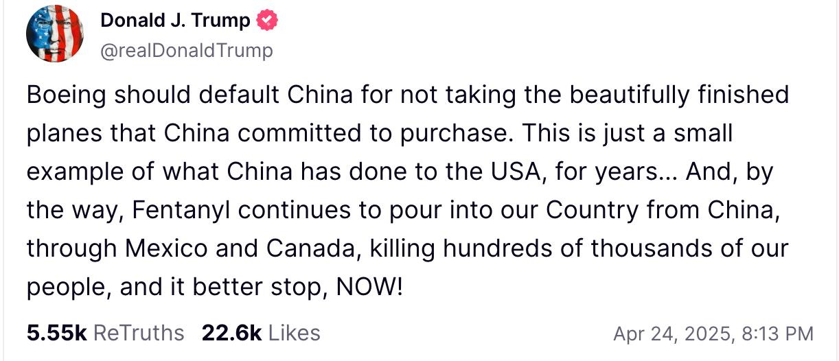 On Truth Social, Trump also accused China of backing out of a Boeing deal and blamed the country for the continued flow of fentanyl into the U.S. China dismissed both allegations in a separate statement.