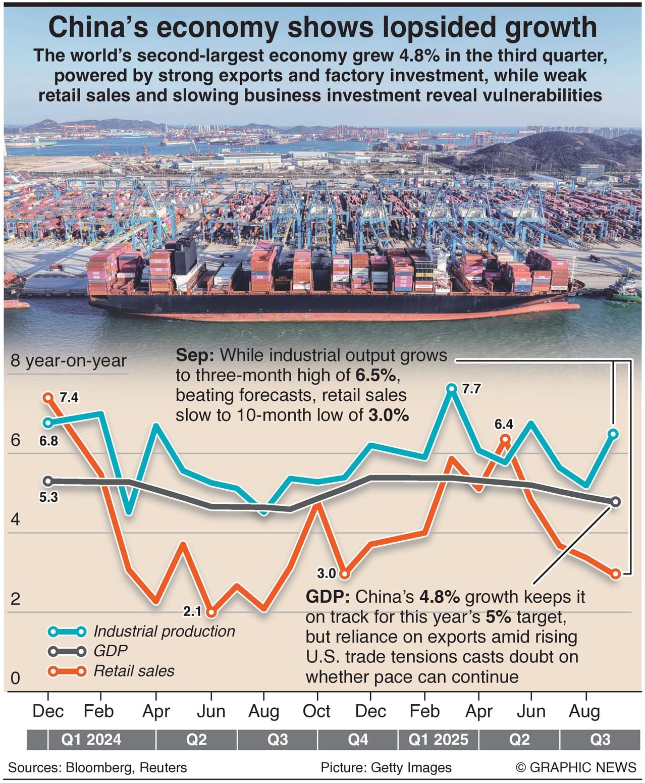 The world’s second-largest economy grew 4.8% in the third quarter, powered by strong exports and factory investment, while weak retail sales and slowing business investment reveal vulnerabilities.