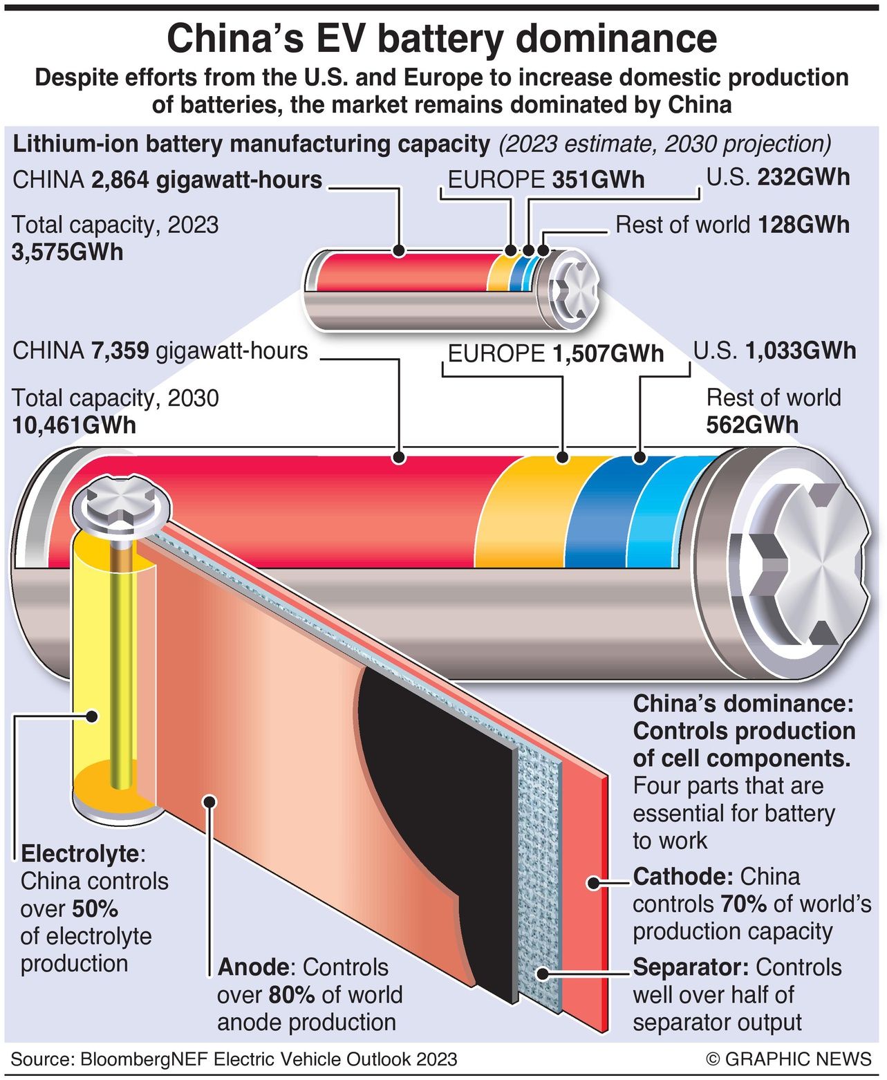 China’s dominance comes from its control of the production of cell components -- the four parts that are essential for a battery to work.