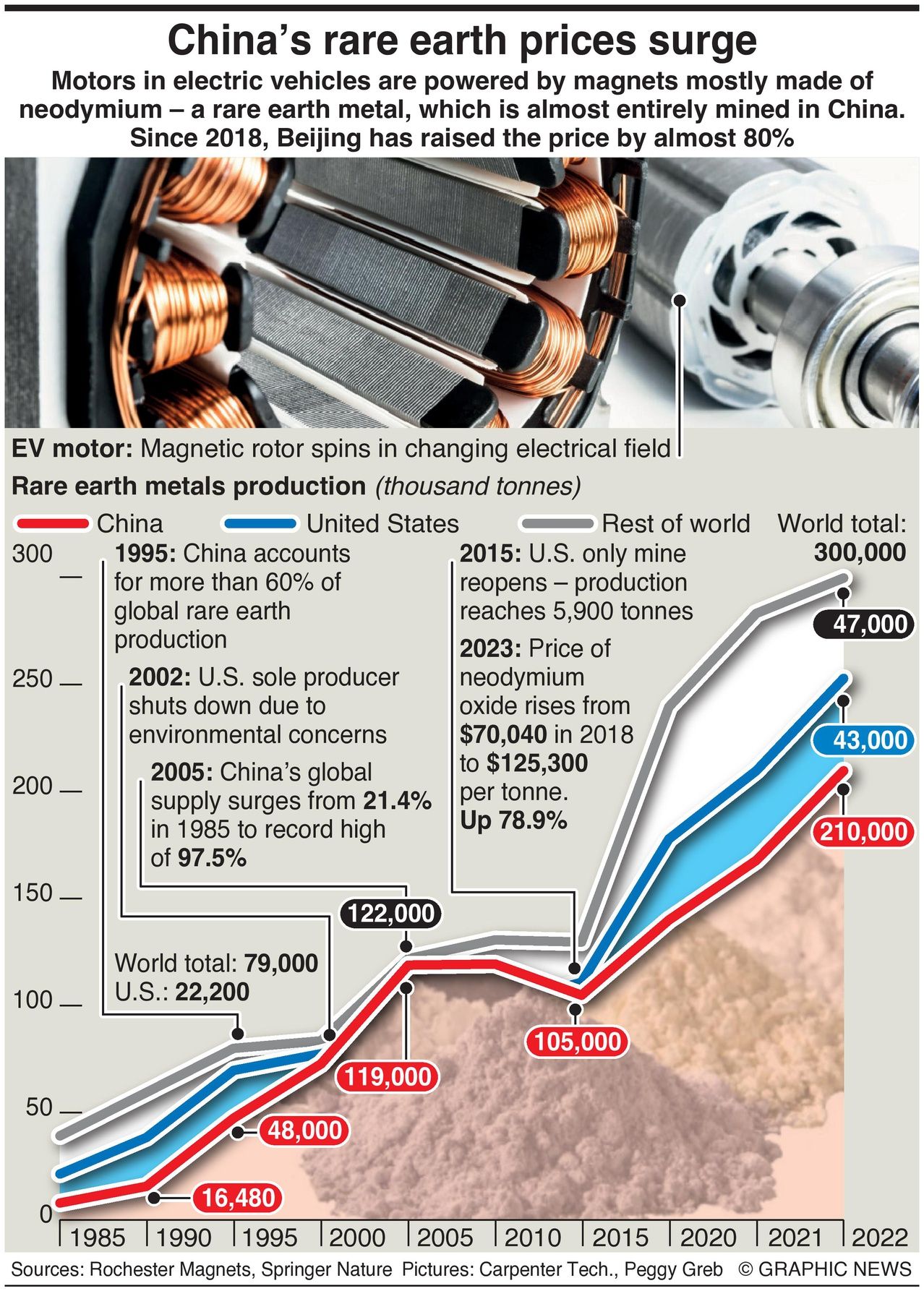 Neodymium oxide is almost entirely mined and processed in China. Since 2018, Beijing has raised the price of neodymium by 78.9%.