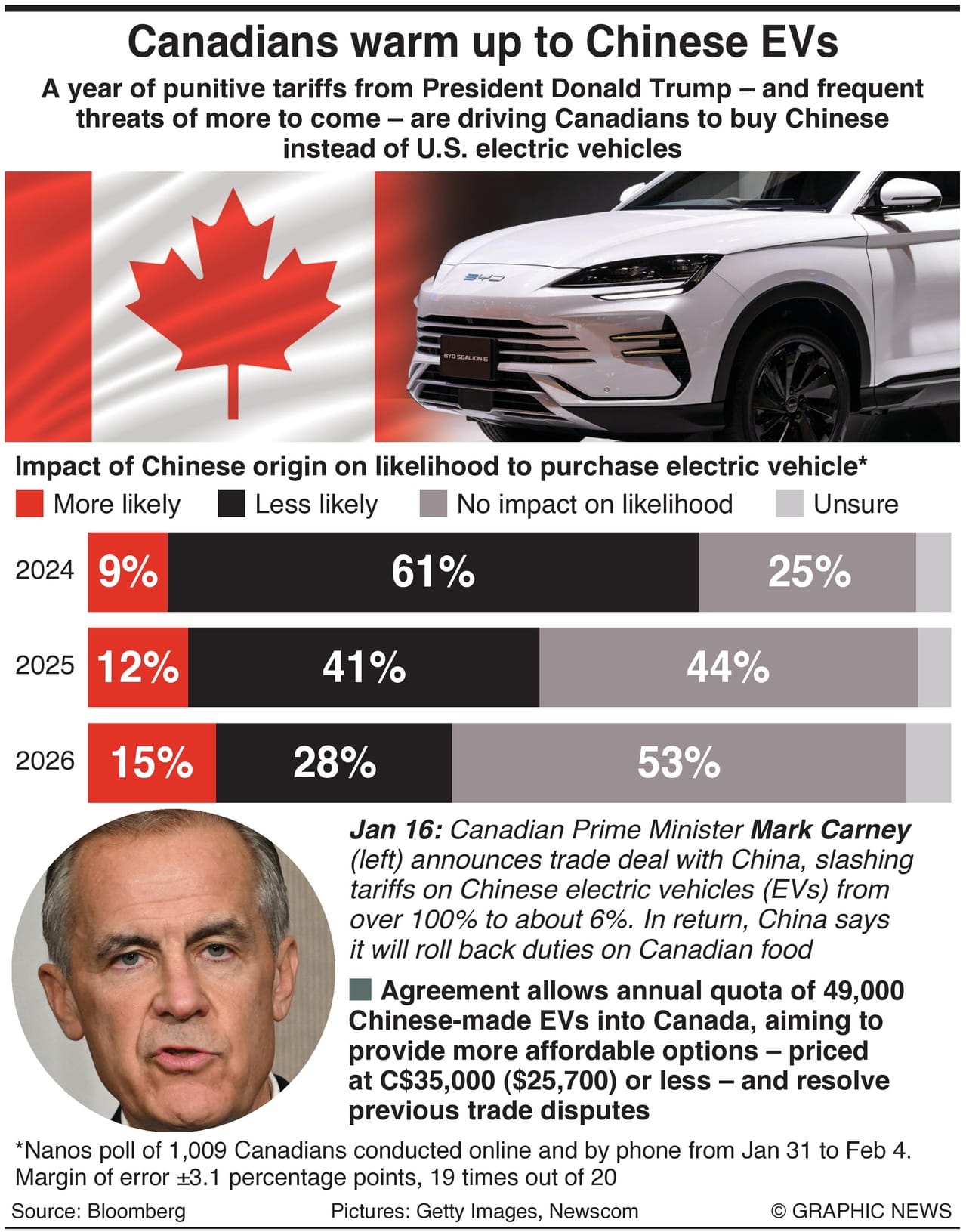 As Prime Minister Mark Carney lowers tariffs on imports of Chinese electric vehicles, new polling suggests Canadians are becoming much more open to buying them.