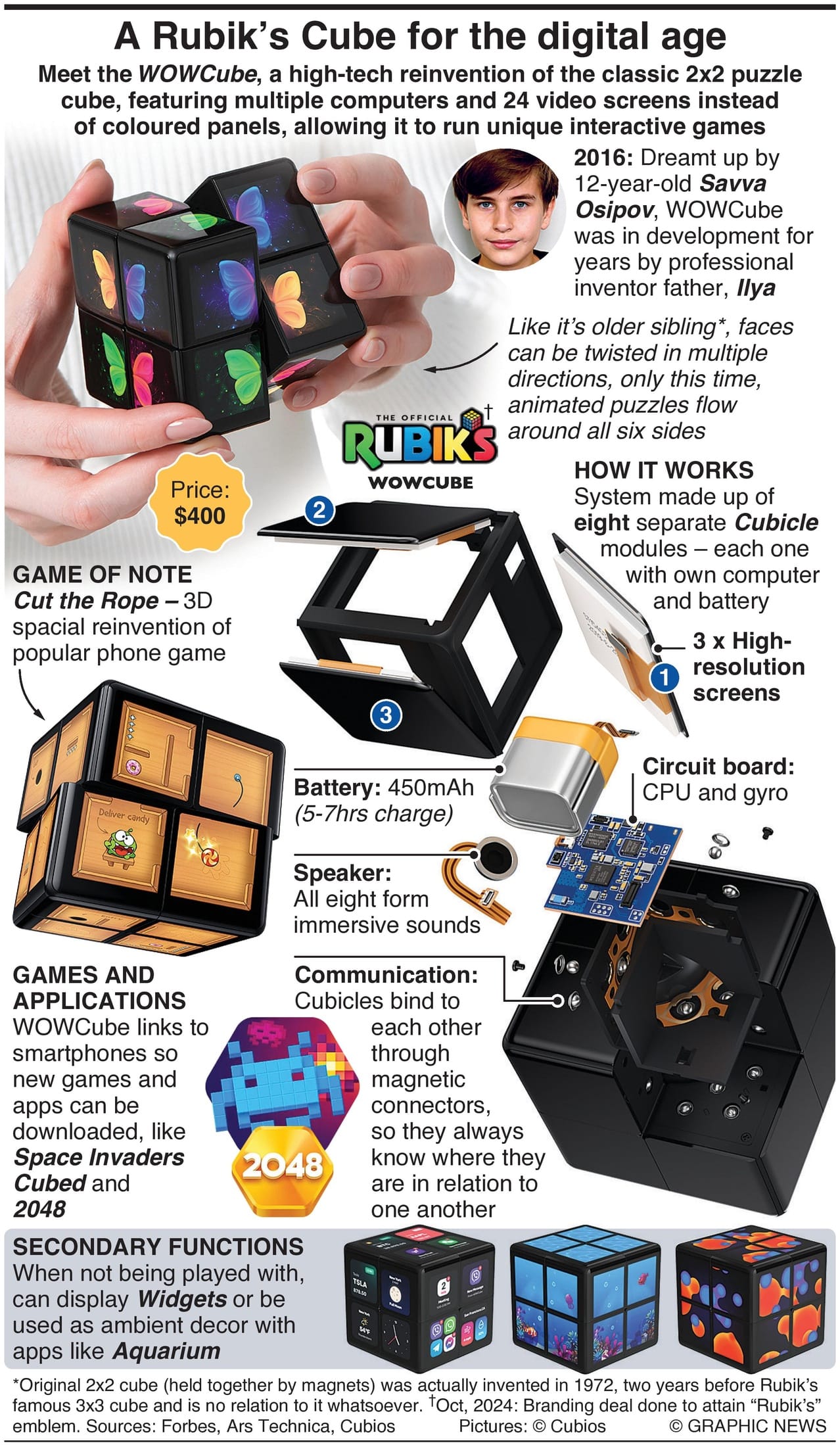 A new WOWCube replaces coloured squares with video screens to create interactive games.