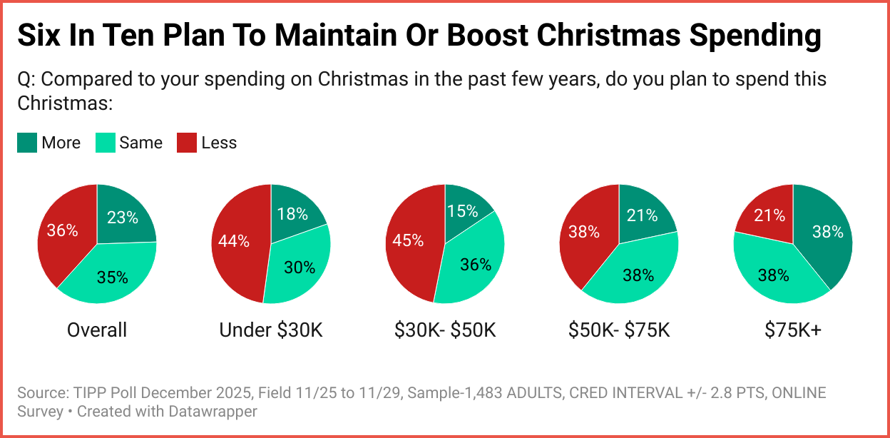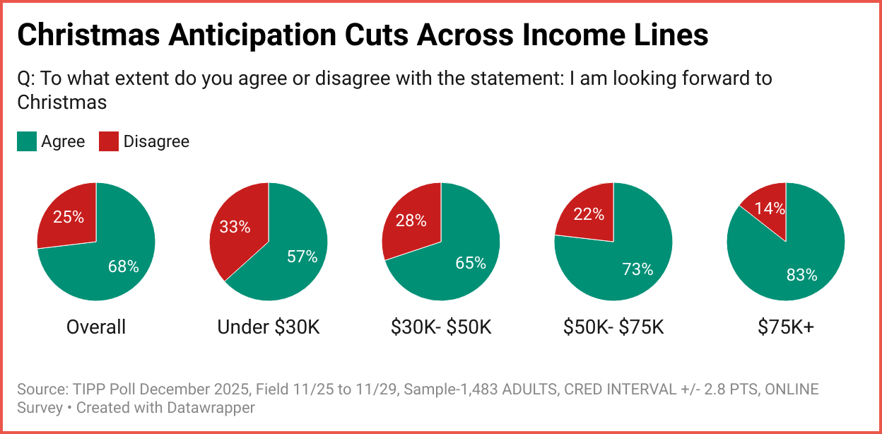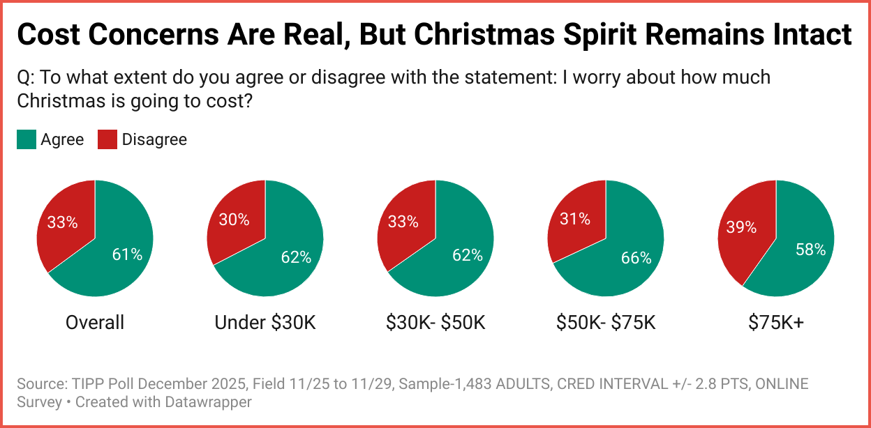 TIPP Poll found that the bite of rising prices has cast a slight shadow on Christmas, but not dampened people’s spirits or the anticipation of the holidays. Here’s a closer look at what the data reveals.