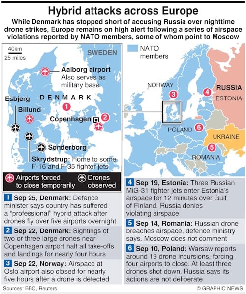 While Denmark has stopped short of accusing Russia over nighttime drone strikes, Europe remains on high alert following a series of airspace violations reported by NATO members, some of whom point to Moscow.