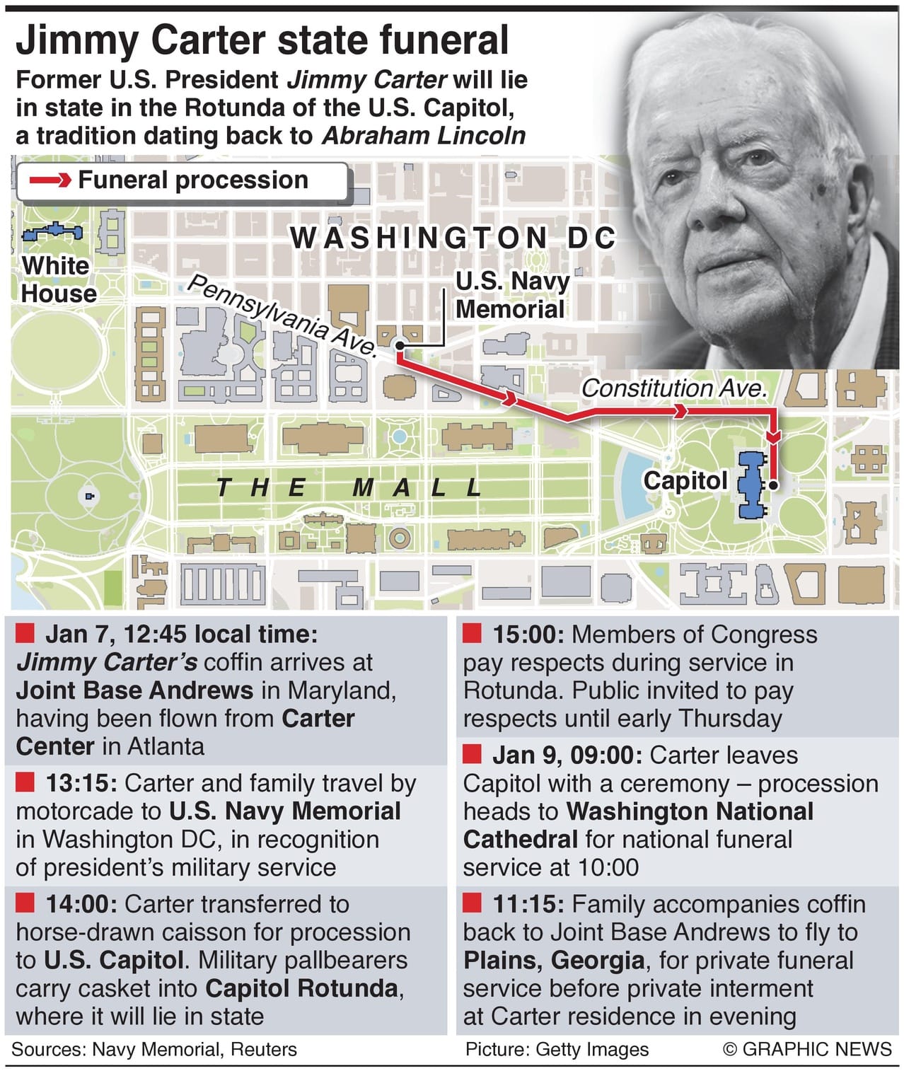 Jimmy Carter’s state funeral, a national tribute traditionally reserved for heads of state, moves to Washington DC, culminating in a National Cathedral service on Jan 9, then a private burial in his hometown of Plains, Georgia.