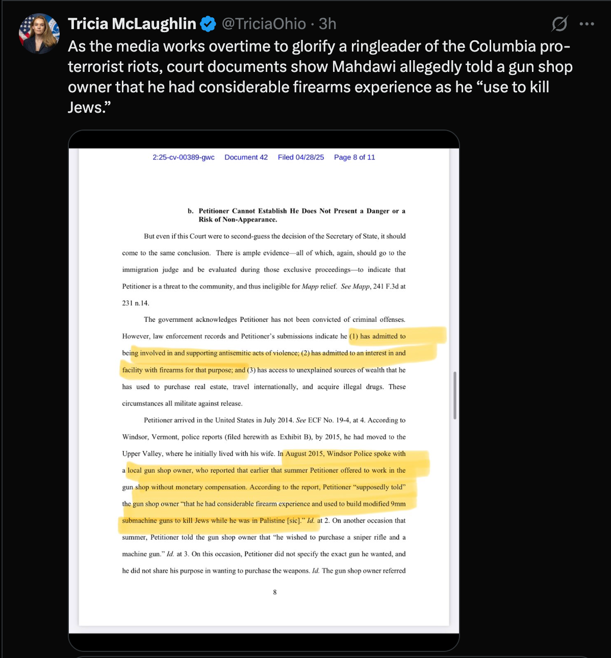 Tricia McLaughlin, Assistant Secretary of the Department of Homeland Security, claimed on X that Mohammad Mahdawi, a Columbia University senior, told a gun shop owner he had firearms experience because he “used to kill Jews,” citing court documents. Mahdawi, who is set to graduate with a philosophy degree, was detained by immigration agents in Vermont last month during what he believed was a citizenship interview.