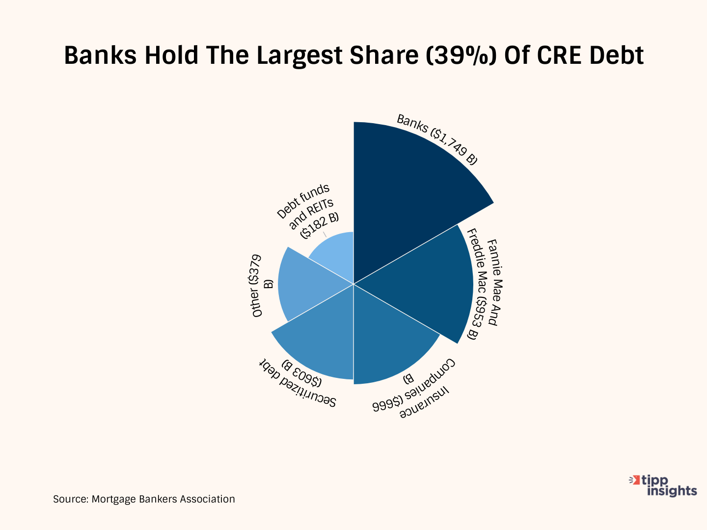 The U.S. commercial real estate sector is valued at $20 trillion. The total amount of commercial real estate loans outstanding is approximately $4.5 trillion, with a loan-to-value ratio of 25%. Mortgage Bankers Association data shows that banks hold the largest share of the debt, accounting for 39%.