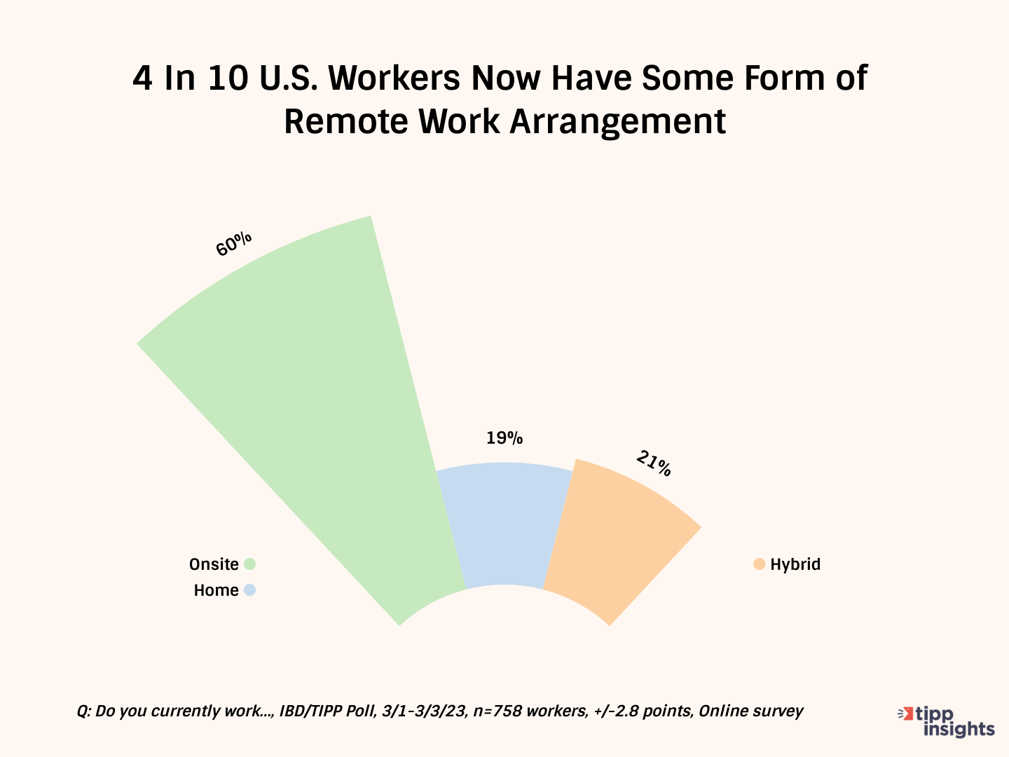 A recent IBD/TIPP Poll found that 60% of American workers only work on-site, 19% only work from home (WFH), and 21% do a combination of both.