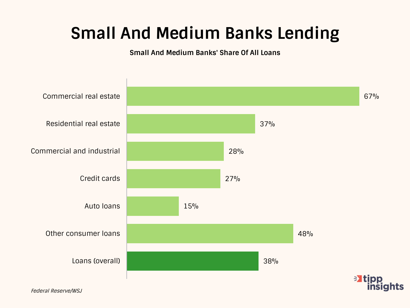 Federal Reserve data, as reported by the Wall Street Journal, shows that banks smaller than the top 25 hold 68% of commercial real estate lending.