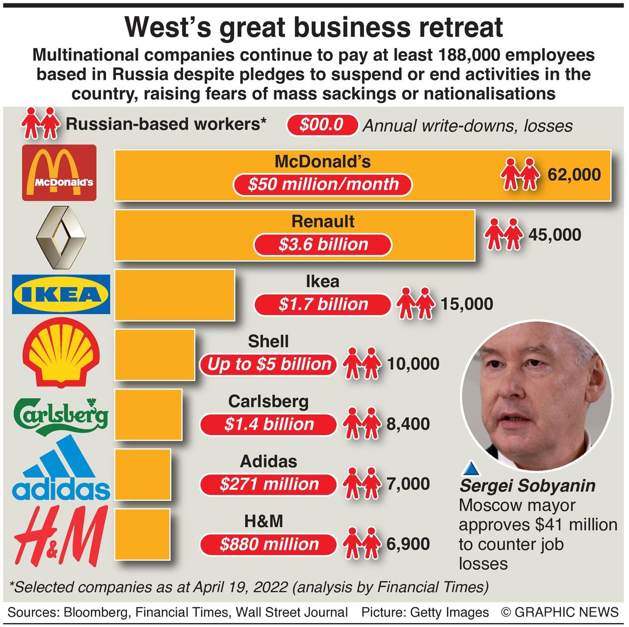 Moscow mayor Sergei Sobyanin has warned that “about 200,000 employees are at risk of losing their jobs.” An analysis by the Financial Times calculates that just seven multinationals are responsible for more than 144,000 Russian jobs. The losses and write-downs of leaving Russia could cost them some $13.5 billion.