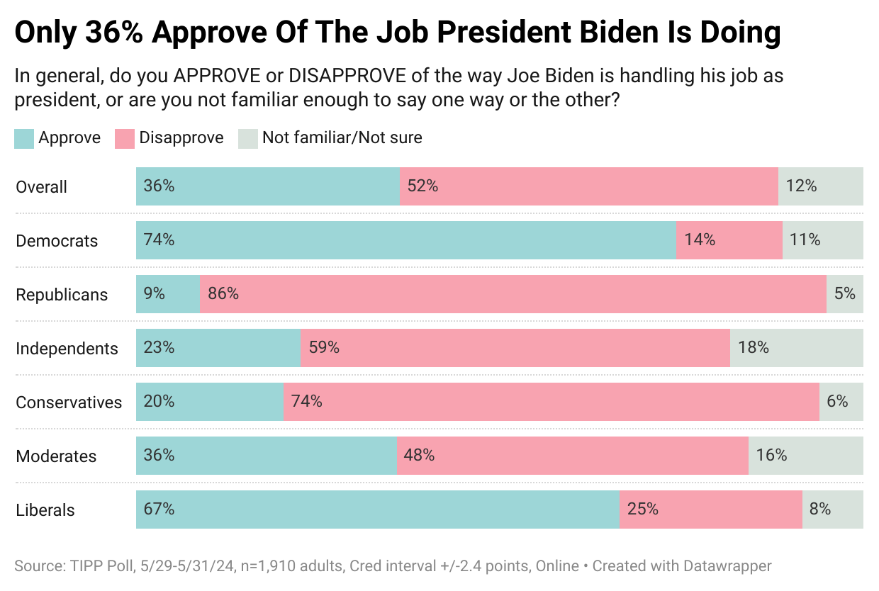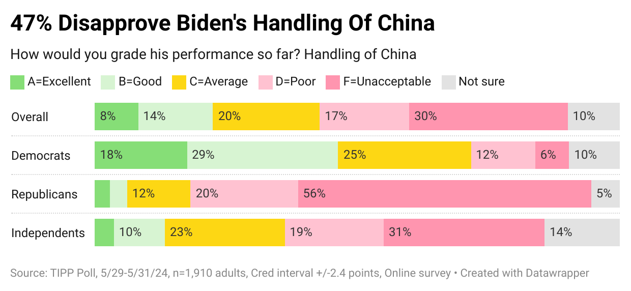 The results are from a nationwide TIPP Poll that surveyed 1,910 Americans from May 29 to May 31. The credibility interval for the survey is +/-2.4 percentage points.