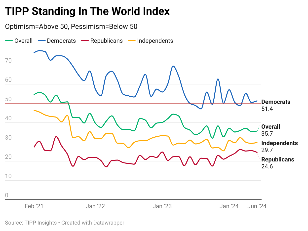 The overall Index has been in the pessimistic region since September 2021. In June, Democrats have the most optimistic reading at 57.7. Republicans have the lowest score (19.4), indicating extreme pessimism. Independents are in the middle at 29.6.