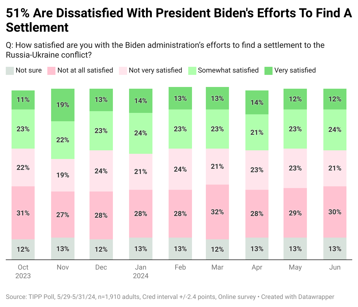 Further, half (51%) of Americans are dissatisfied with President Biden’s efforts to find a settlement. In fact, Biden authorized the use of American weapons to hit internal targets in Russia, escalating the situation. Only 36% are satisfied.