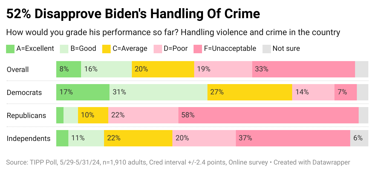 This month, over half (52%) give Biden failing grades for his handling of crime. Only 24% give him an A or B.