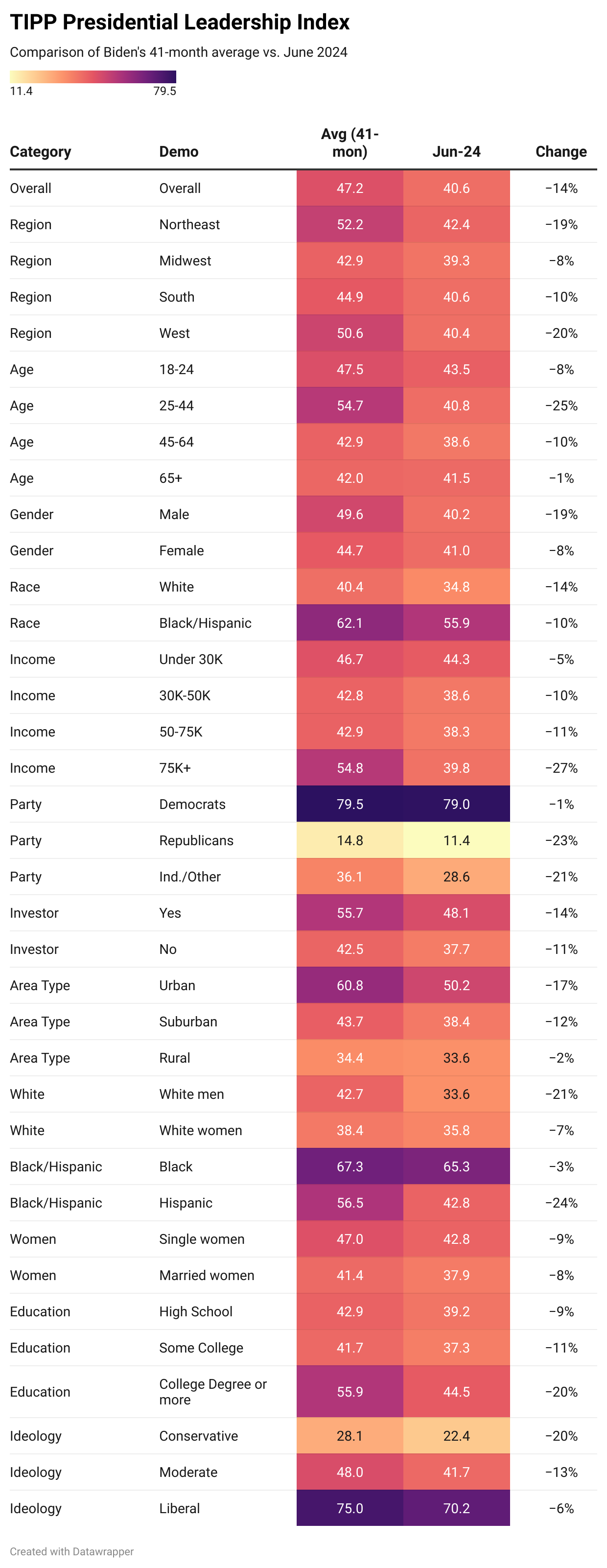 Notice that his June 24 readings are below his 41-month average for all 36 demographic groups we track. Further, the change is in double digits for 23 of the 36 groups.