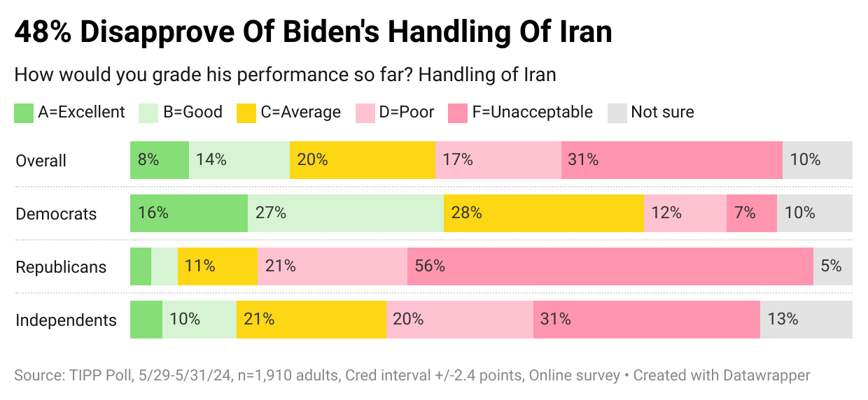 Nearly one in two (48%) gives Biden failing grades for his handling of Iran, while around one-fifth (22%) give him favorable grades.