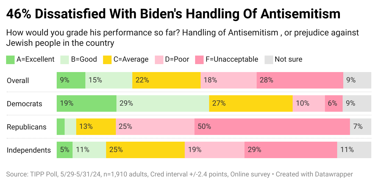 The ongoing conflict in the Middle East has brought attention to antisemitism in America. Many feel that Biden has not addressed the problem forcefully enough. Only one-fourth (24%) gave him good grades for handling the situation.