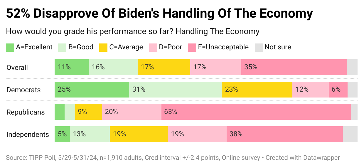 Overall, one-half (52%) give Biden a “D” or “F” for his handling of the economy. Only 27% give him good grades.