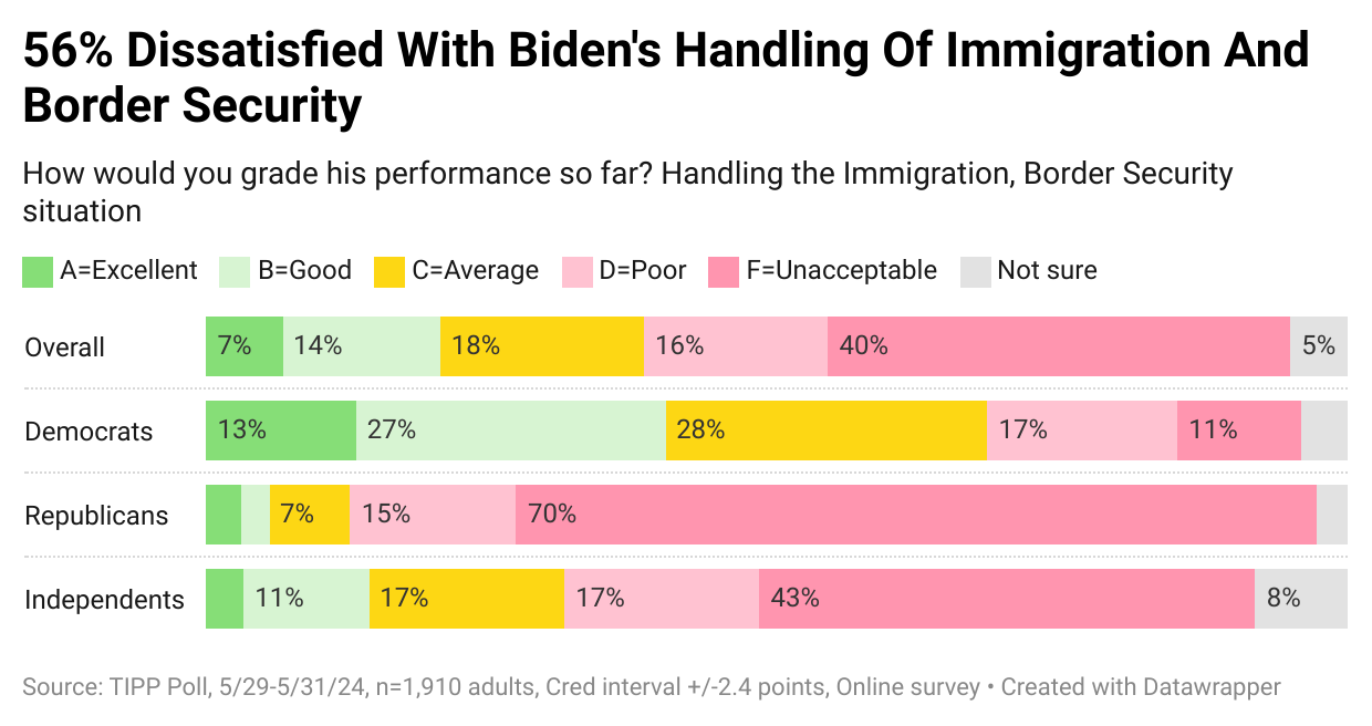 The majority (56%) are dissatisfied with his handling of immigration and border security. Only one in five (21%) are satisfied. While 40% of Democrats are satisfied, 85% of Republicans are dissatisfied. Meanwhile, two-thirds (60%) of independents are dissatisfied.
