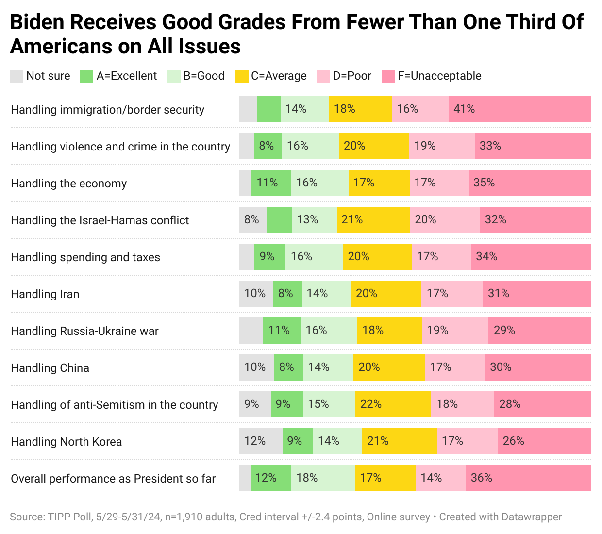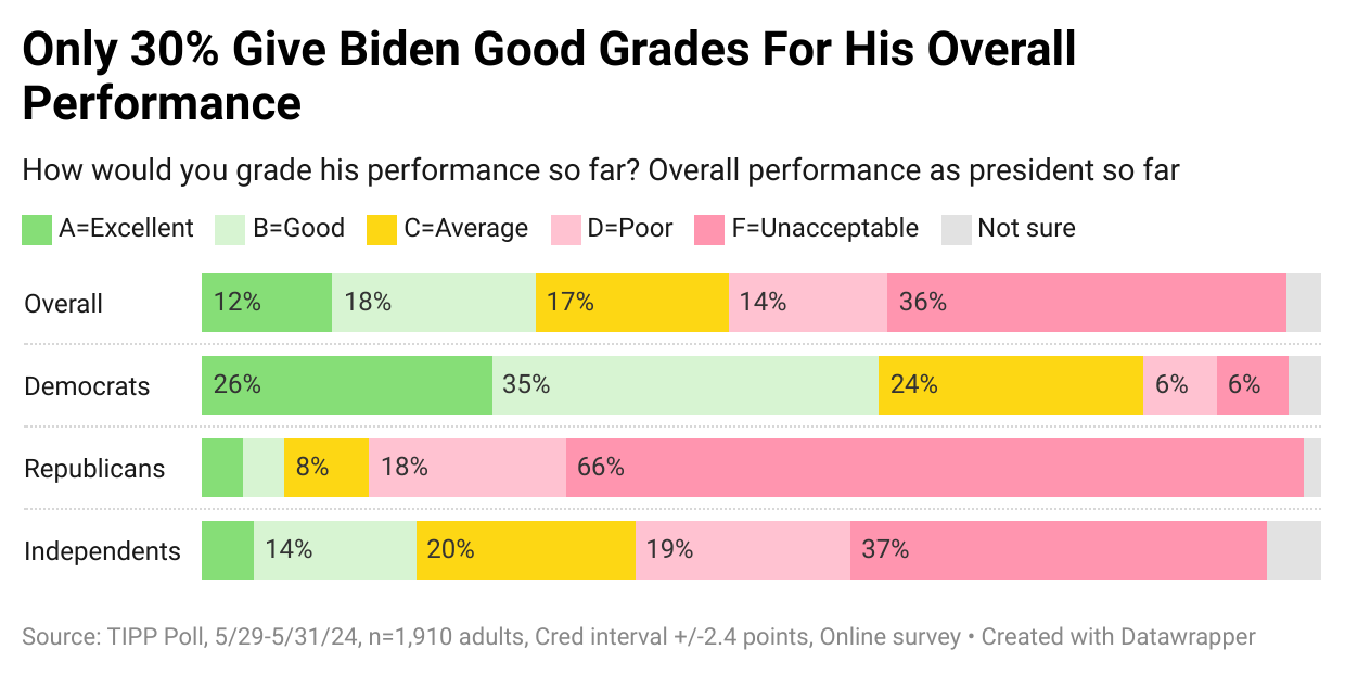 When asked to grade Biden’s overall performance as president, only 30% gave him an A or B, six points less than his job approval of 36%.