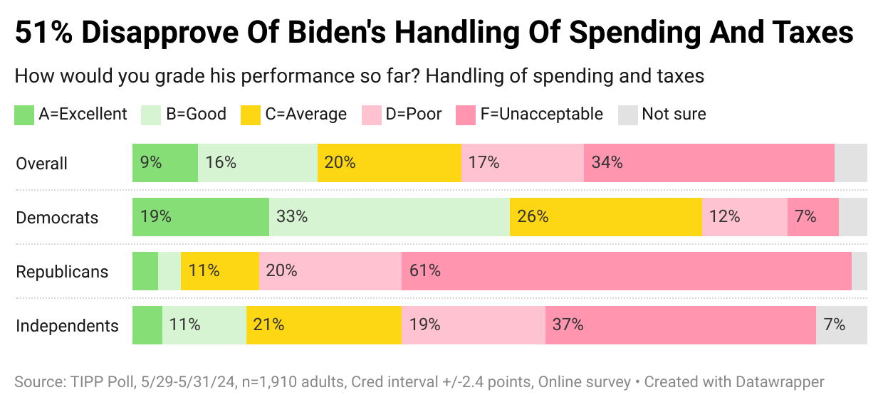 Overall, one-half (51%) gave President Biden a “D” or “F” for handling spending and taxes. Only 25% give him good grades.