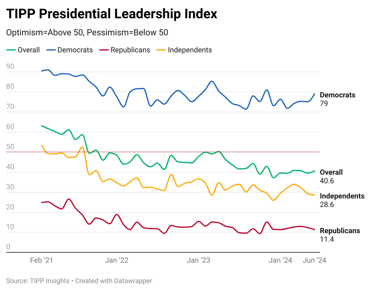 The Presidential Leadership Index improved by 1.1 points, recording 40.6 in June from 39.5 in May. However, among the 36 demographic groups we track, only five posted readings above 50, indicating the challenge of broadening support across various segments of the population.