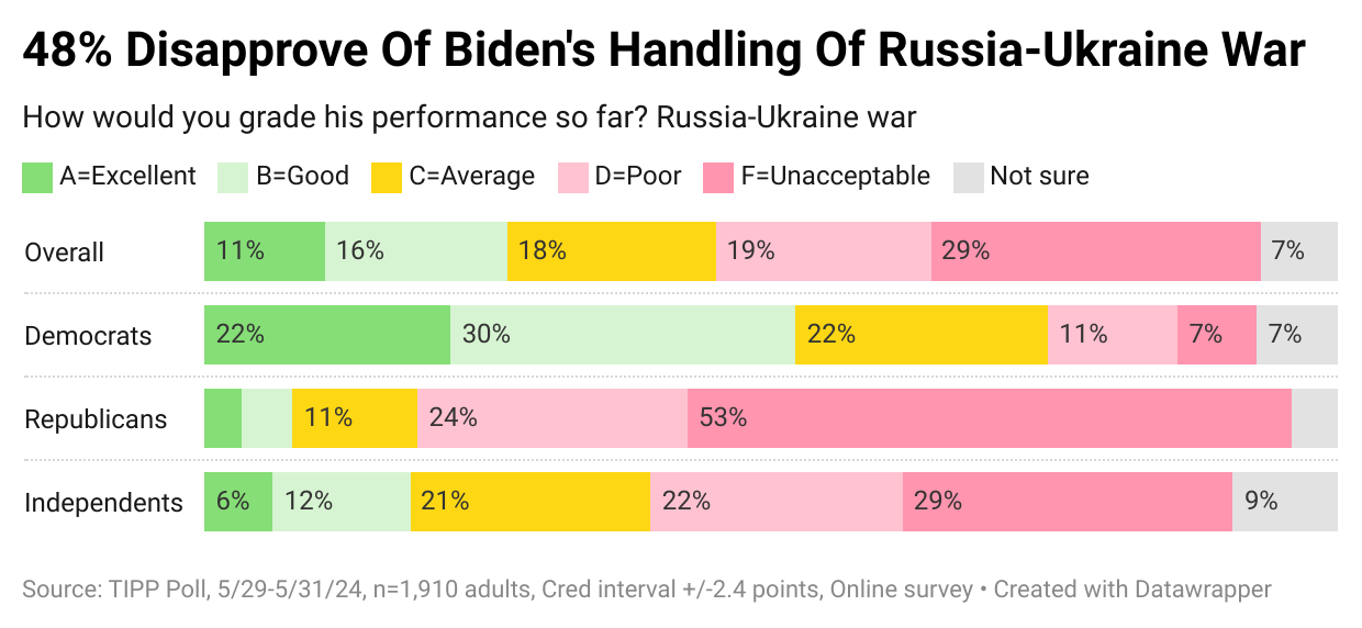 Our data echoes the dissatisfaction, with 48% giving him a D or F for handling the war. Only 27% see Biden in a positive light on this issue.