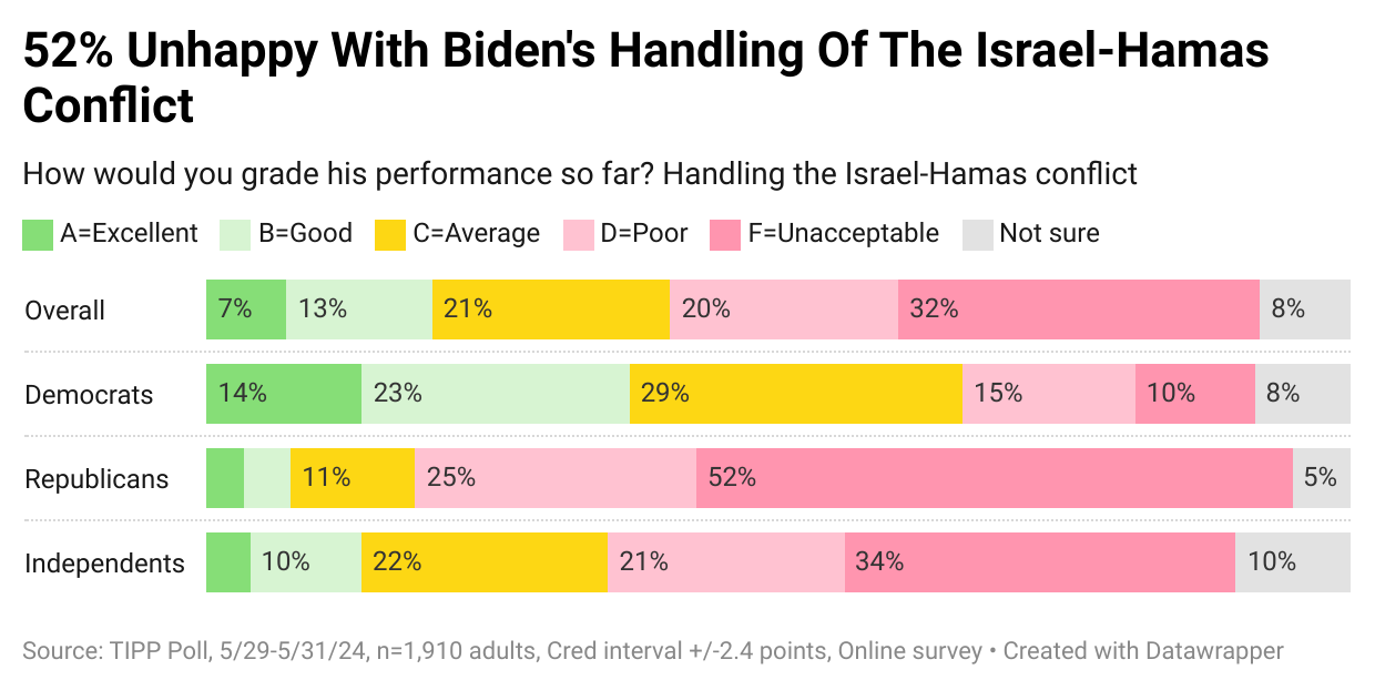One-half (52%) of the survey participants are unhappy with Biden’s handling of the Israel-Hamas conflict. Just a fifth (20%) give him good grades.