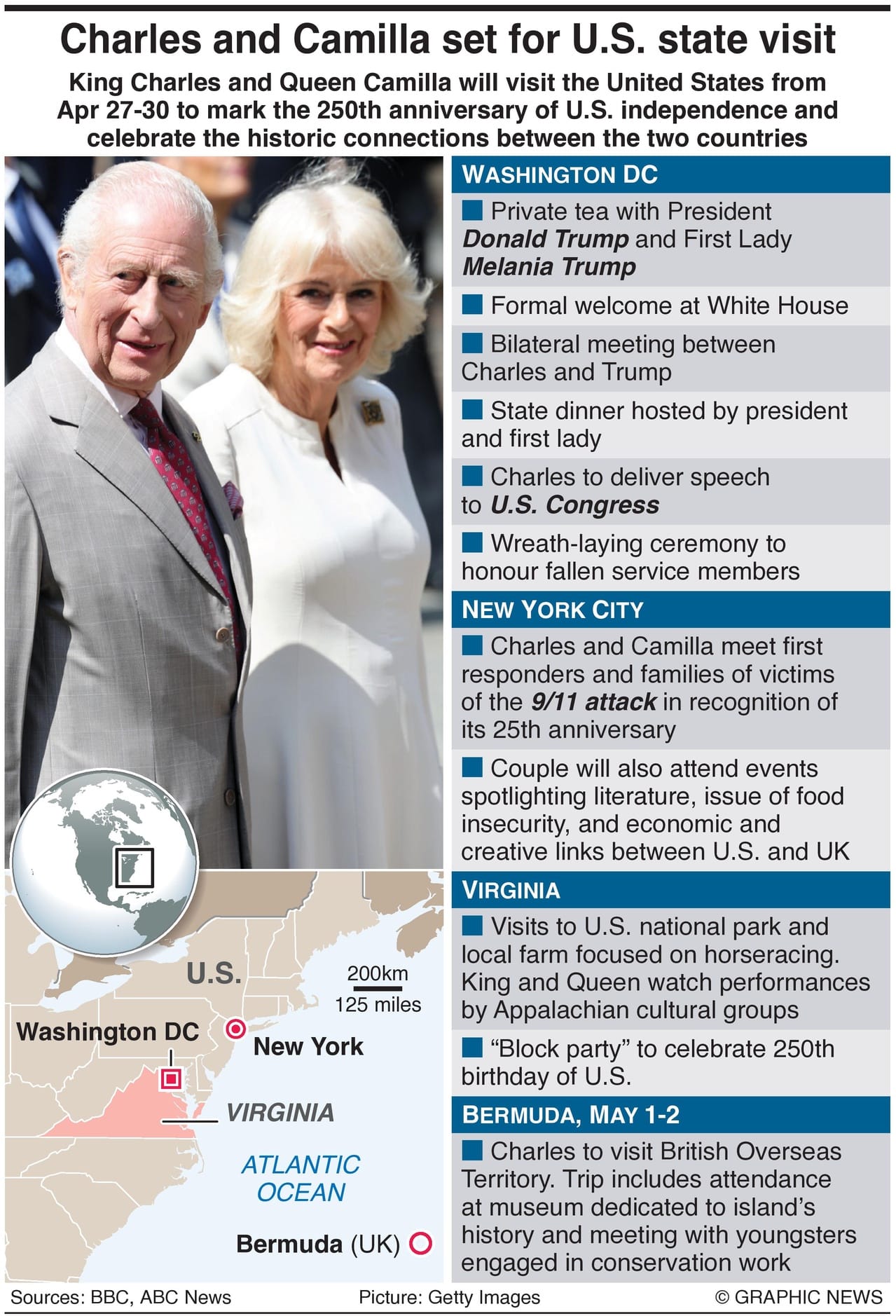 King Charles and Queen Camilla are on a four-day state visit to the United States (April 27–30), marking America’s 250th anniversary of independence. The trip includes stops in Washington, D.C., New York, and Virginia, with meetings, a state dinner, and events highlighting U.S.-U.K. ties.