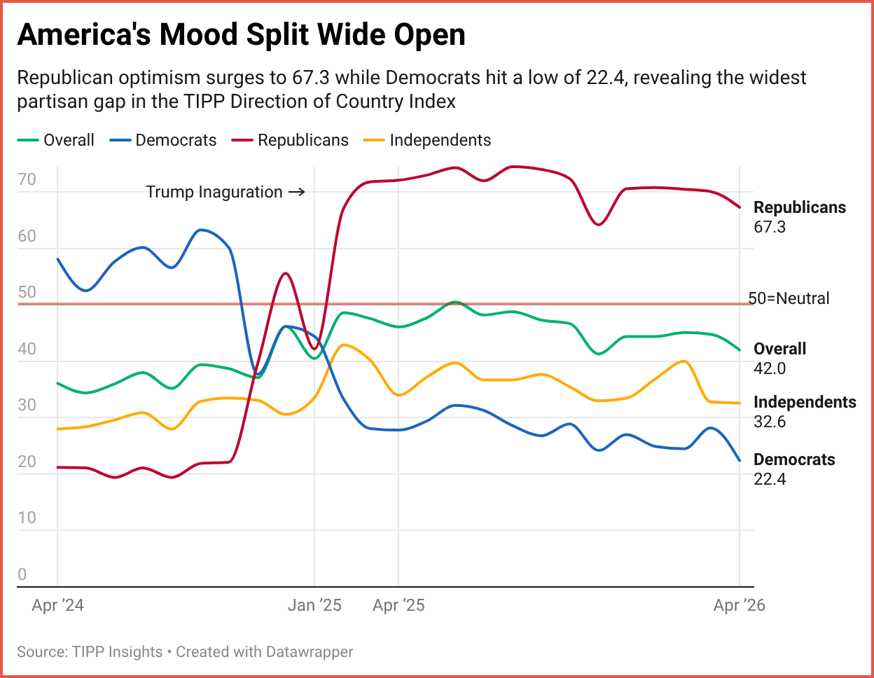 Republicans feel great about where the country is headed, Democrats don't — and Independents are closer to tuning out than buying in.