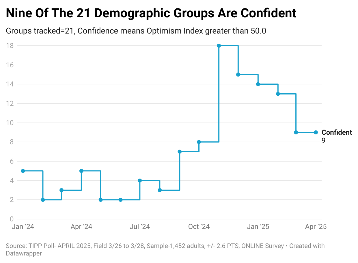 The RCM/TIPP Economic Optimism Index has three key components. In April, two of them declined.