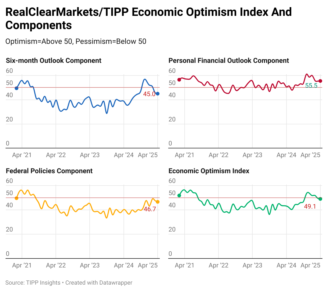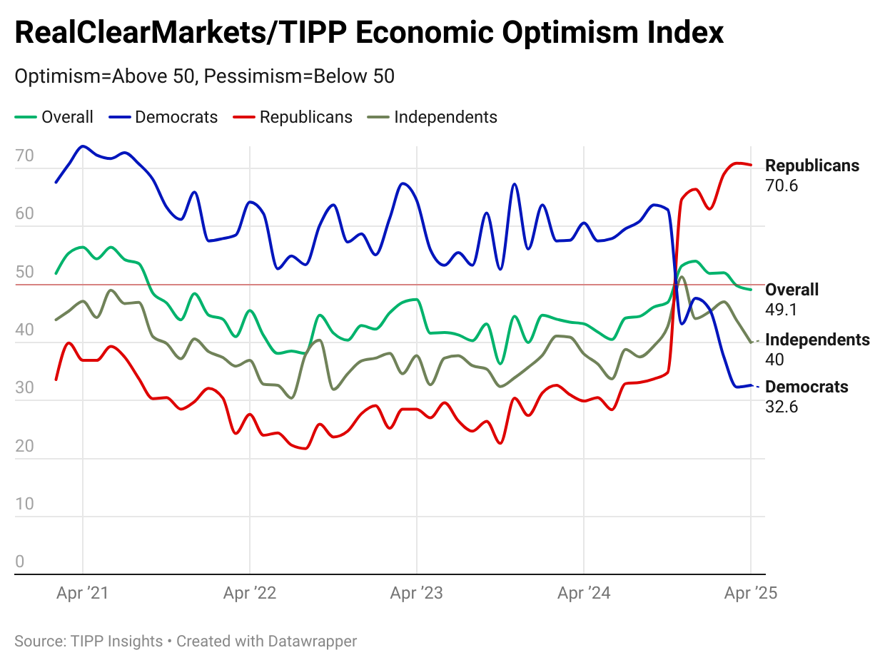 The RealClearMarkets/TIPP Economic Optimism Index, a key gauge of consumer sentiment, declined from 49.8 in March to 49.1 in April, representing a 1.4% decrease. After hitting a 40-month high of 54.0 in December, the index eased to 51.9 in January and 52.0 in February before falling below the 50.0 threshold in March. April's reading of 49.1 marks the second consecutive month in pessimistic territory. Since President Trump’s re-election in November 2024, the index had remained in optimistic territory until February.