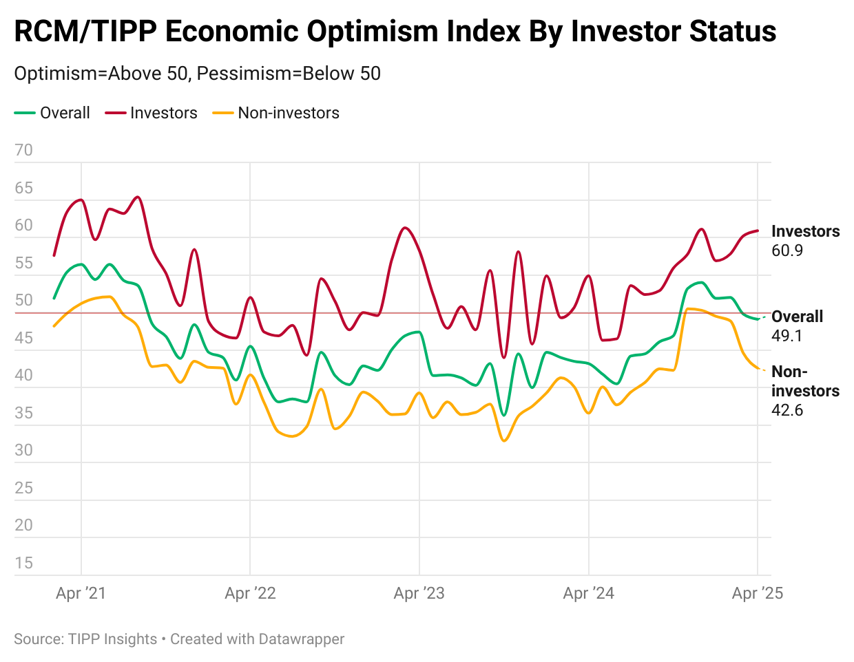 RCM/TIPP surveyed 1,452 adults from March 26 to 28 for the April index. The online survey utilized TIPP's network of panels to obtain the sample. A more detailed methodology is available here. The Index ranges from 0 to 100. Readings above 50 indicate optimism, while those below 50 signal pessimism. A score of 50 is neutral.