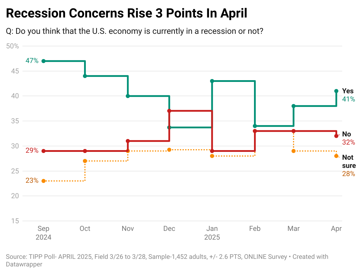 Over four in ten (41%) believe the United States is in a recession, while 32% think it is not. Another third (28%) are not sure. The share of Americans who have a positive view increased from 27% in November to 32% in April.