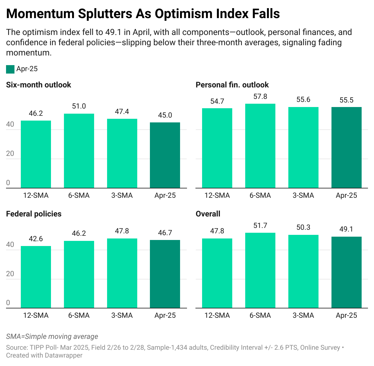 In April, the Economic Optimism Index, along with the Six-Month Outlook, Personal Financial Outlook, and confidence in federal policies, fell below their three-month moving averages, suggesting a slowdown in sentiment.