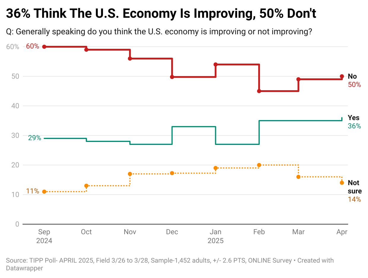 Meanwhile, one-half (50%) think the U.S. economy is not improving, while 36% believe it is improving. The share of Americans having a positive view increased from 27% in November to 36% in April.