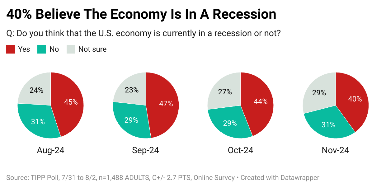 Four in ten (40%) believe we are in a recession, while 31% think we are not. Another 24% are not sure. The share of Americans who believe we are in a recession has dropped from 45% in August to 40% in November.