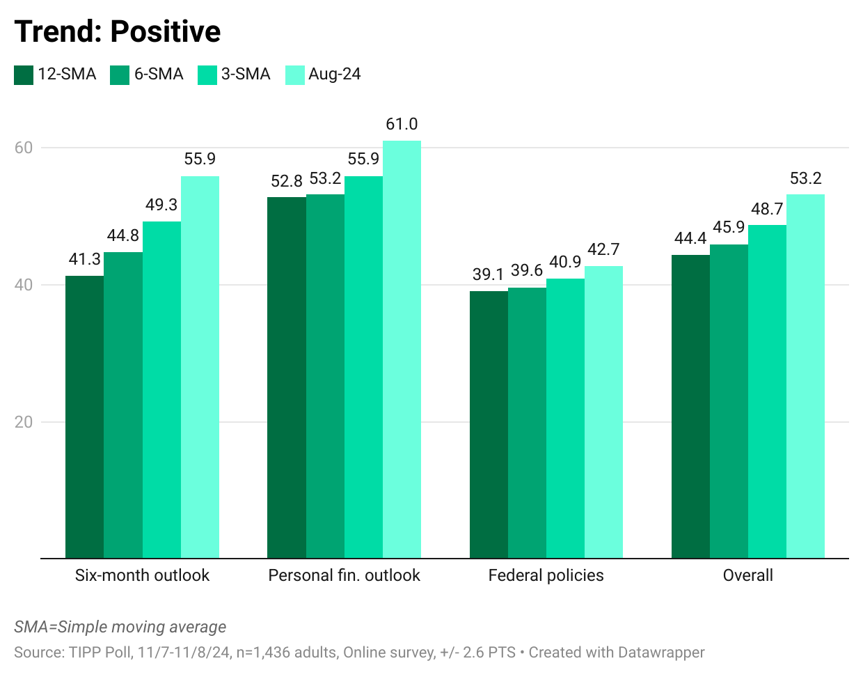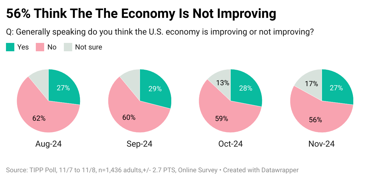 RCM/TIPP surveyed 1,436 adults for the November Index from November 7 to November 8, after it was confirmed that Donald Trump was elected to become the 47th President. The online survey utilized TIPP's network of panels to obtain the sample. A more detailed methodology is available here.