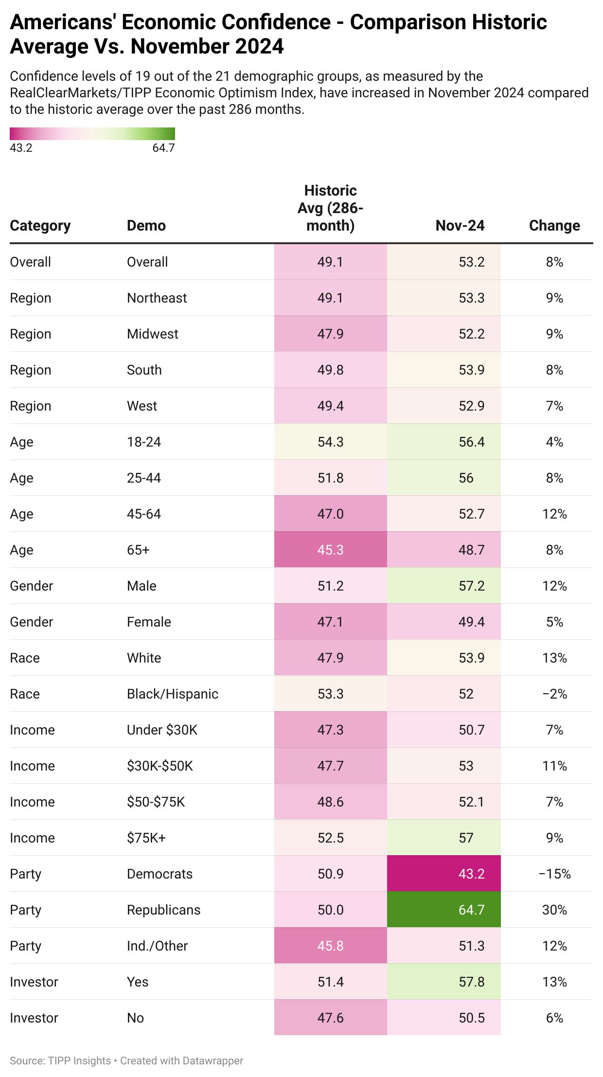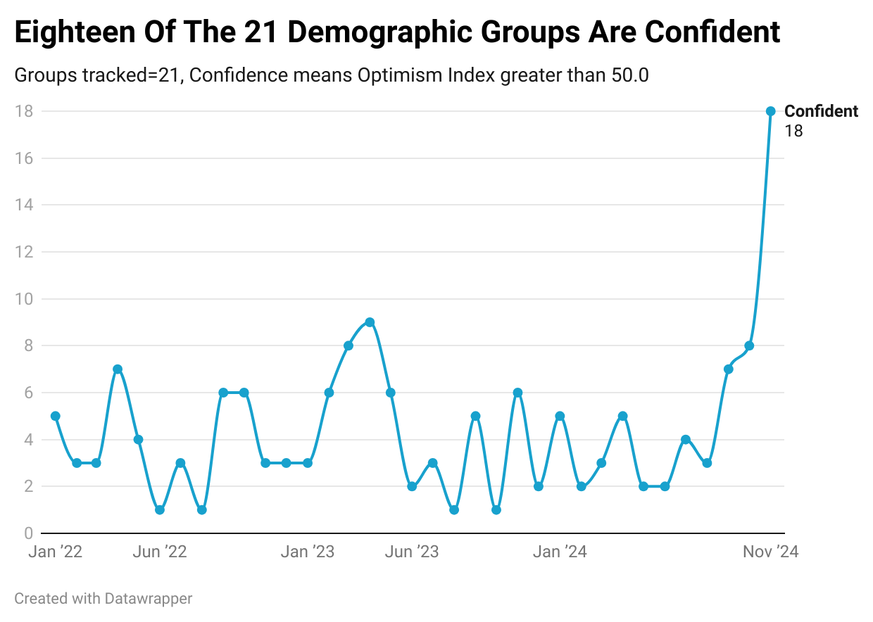 Economic optimism levels for 19 of 21 demographic groups are higher in November 2024 than the historical average of the past 286 months.