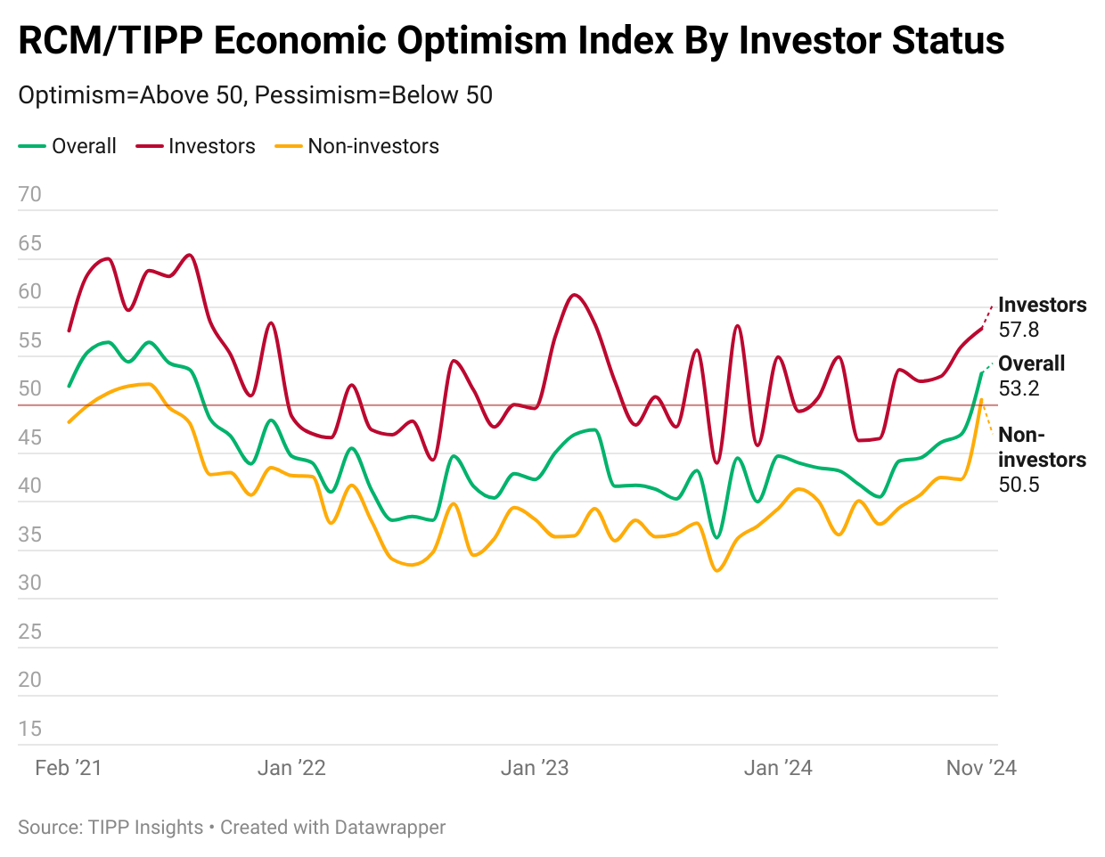 Investor optimism rose by 3.4%, climbing from 55.9 in October to 57.8 in November, while non-investors saw a bigger increase of 19.4%, from 42.3 to 50.5. The economic optimism gap between investors and non-investors narrowed to 7.3 points in November, down from 13.6 in October, 10.4 in September, and 11.7 in August.